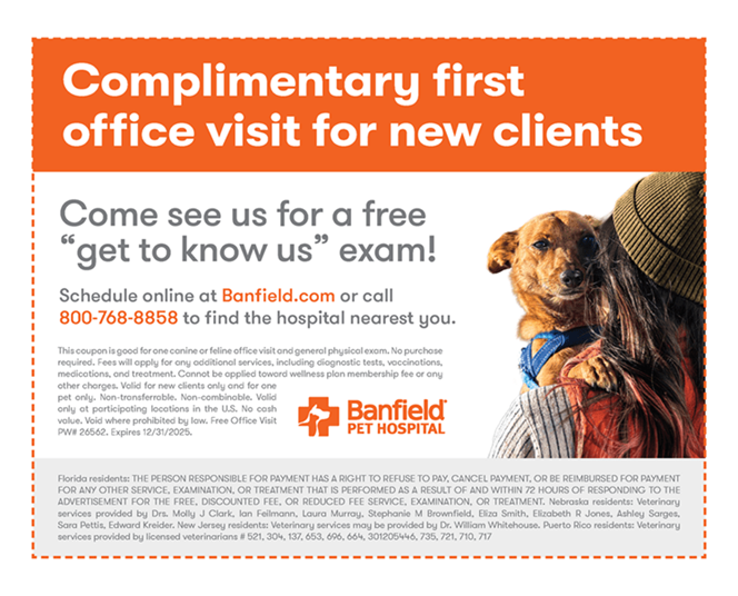 Delivery may be delayed due to acts beyond. Complete and submit the form to print your coupon. New Banfield Pet Hospital clients can get a FREE Pet Exam and Consultation at any of their locations.